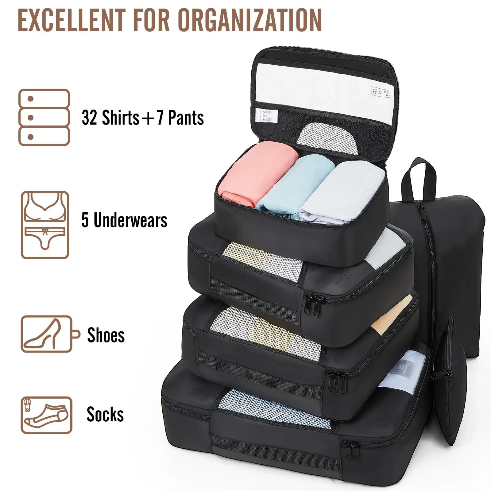 Includes 8 packing cubes and pouches